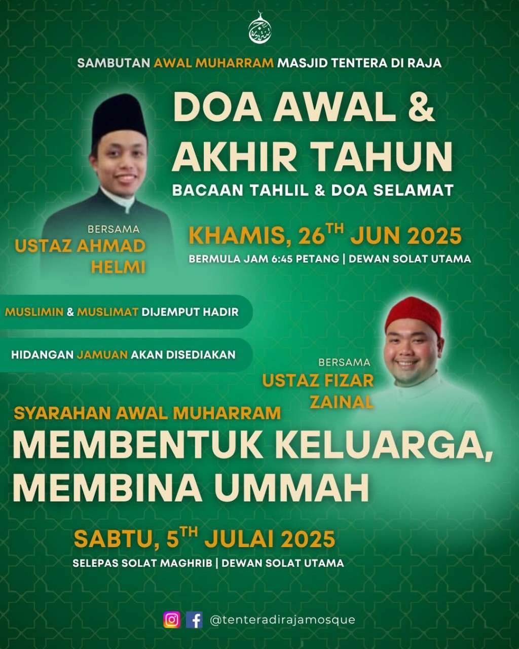 26 Jun, 2025 From 6:45 PM to 8:30 PM Dewan Solat Utama, Tentera Di Raja Mosque, Singapore View MapEvent will be conducted in Malay/English
